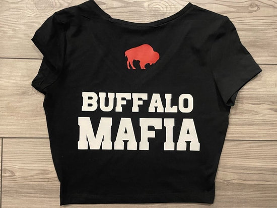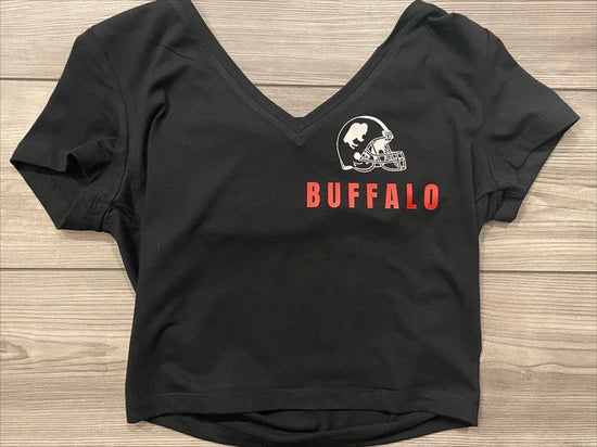 black crop v neck with white buffalo helmet and the word ‘buffalo’ under it on left chest!