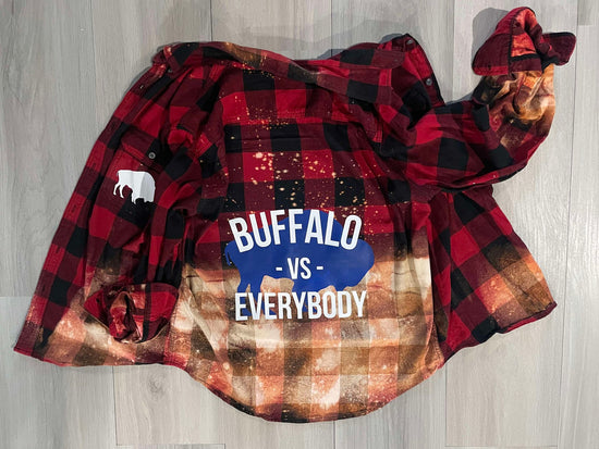 BLEACHED BACK FLANNEL IN RED "BUFFALO VS EVERYBODY" IN UNISEX/MENS SIZING