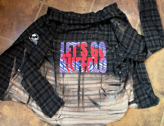 BLEACHED BACK FLANNEL " LET'S GO BUFFALO " IN DARK GREY FLANNEL