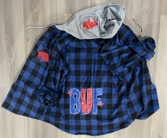 Blue Hooded Flannel with Glitter BUF on Back and extra buffalo details on pocket and hood. unisex and mens sizing.