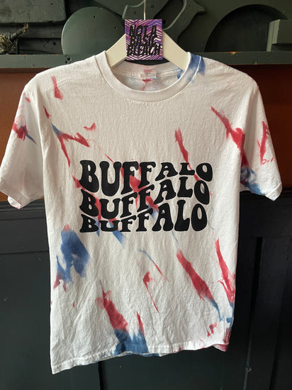 Spray dye tee in unisex tee! Red and blue spray dye with groovy buffalo buffalo buffalo! ❤️🤍💙