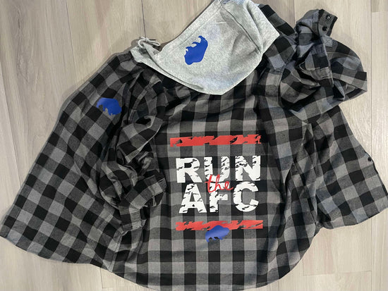 Grey Hooded RUN THE AFC Flannel with unisex sizing and details on the pocket and hood